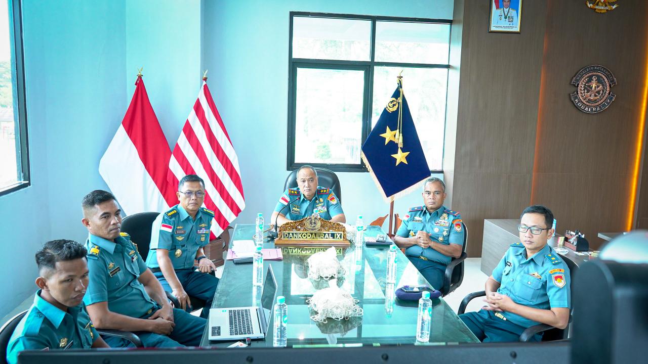 Tampak hadir dalam Vicon yang digelar di di Ruang Kerja Komandan Kodaeral IX, Halong, Kota Ambon, Maluku ini antara lain Wadan Kodaeral lX, Laksma TNl Dr. Muhammad Risahdi, Sahli D Jemen, Kolonel Laut (KH) Slamet Basuki dan tim.