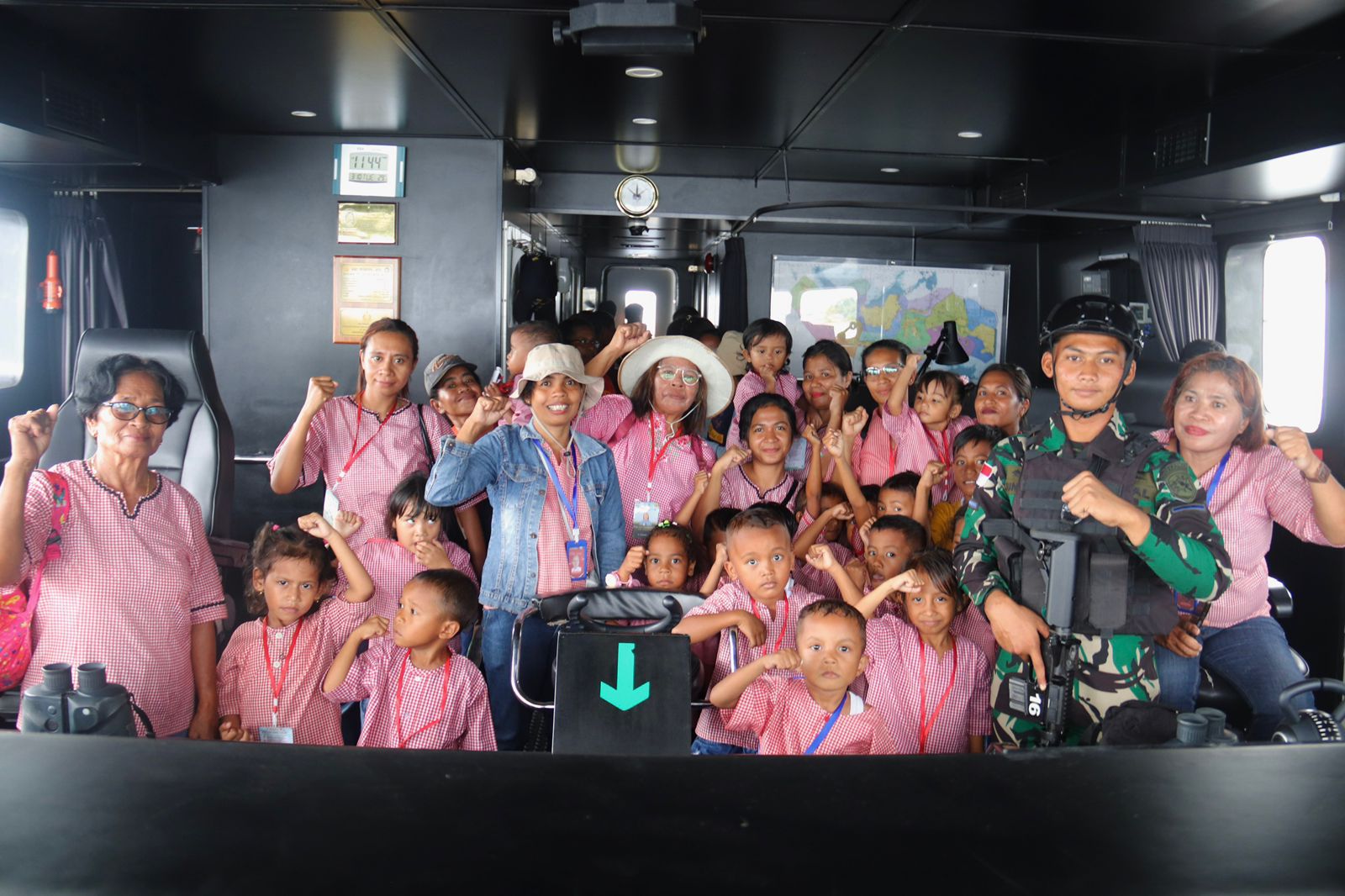 Dengan bahasa yang sederhana dan mudah dipahami anak-anak, para pendamping memberikan edukasi mengenai fungsi kapal perang dalam menjaga kedaulatan laut Indonesia serta peran prajurit TNI Angkatan Laut dalam melindungi wilayah perairan nasional.