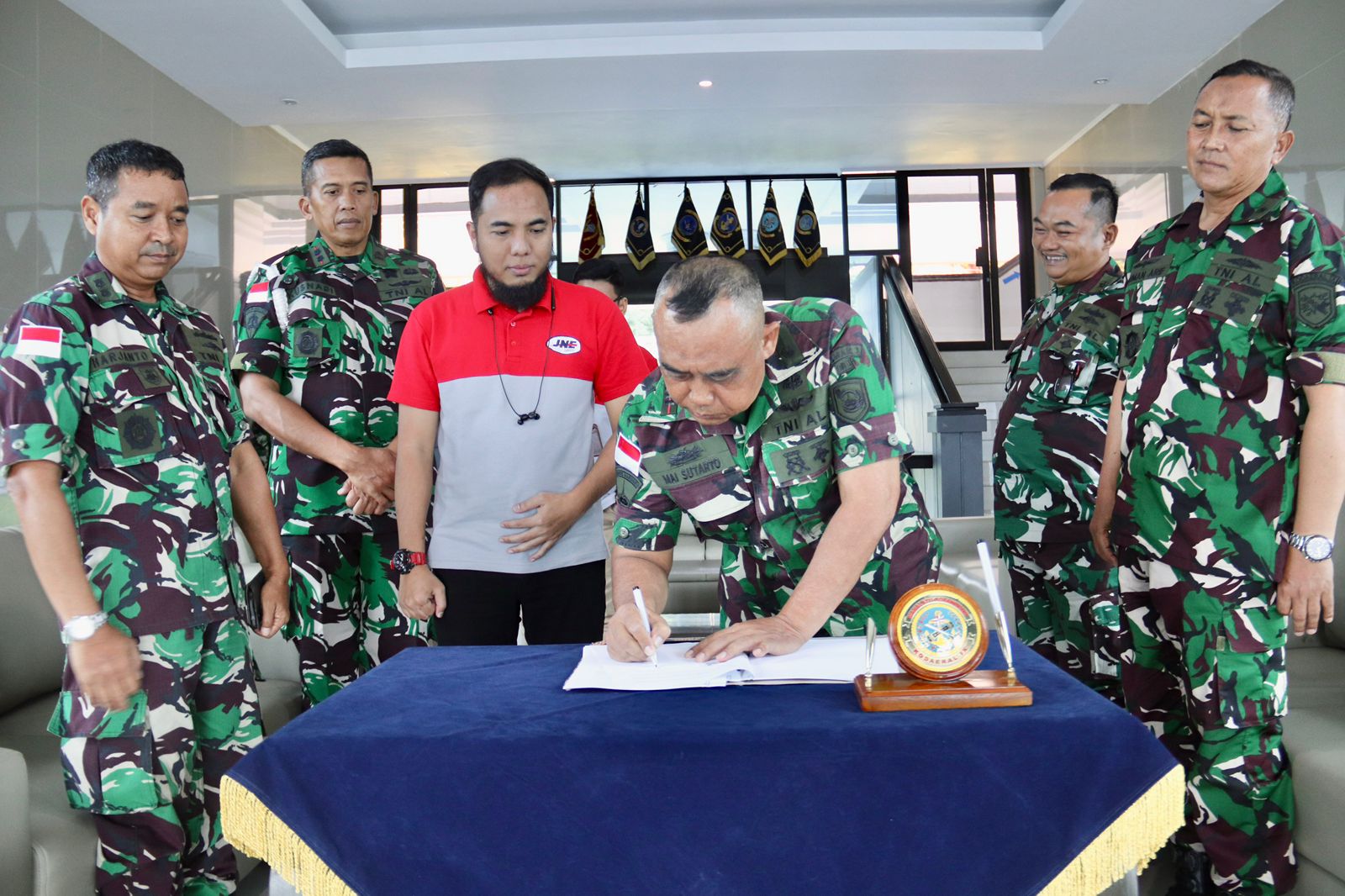 Bertempat di Lobby Markas Komando Daerah TNl Angkatan Laut lX (Kodaeral lX), Halong, Baguala, Kota Ambon, Maluku, Kodaeral lX dan PT. JNE Kota Ambon menandatangani Kesepakatan Bersama dan Perjanjian Kerja Sama (PKS) tentang Pelayanan Jasa Pengiriman Barang pada Jumat (13/3/2026).